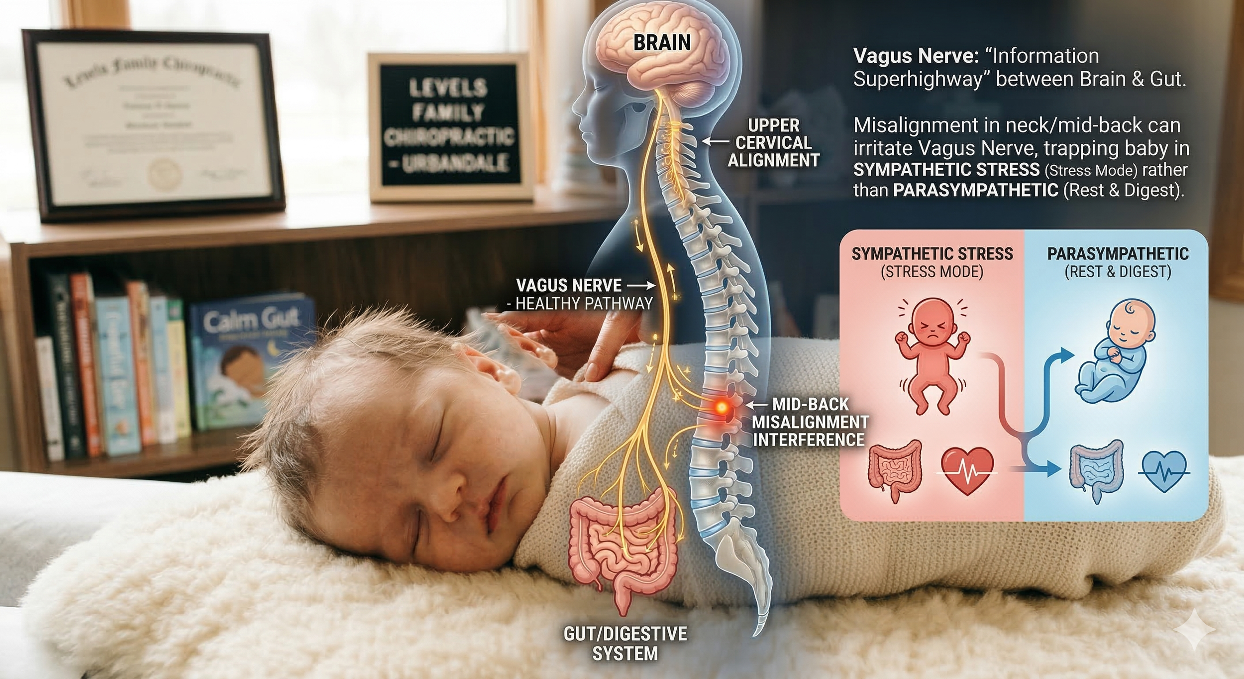 When a baby has a misalignment in their upper cervical spine (neck) or mid-back, it can interfere with the Vagus Nerve. This nerve is the "information superhighway" between the brain and the gut. If the Vagus Nerve is irritated, the baby’s body stays in a state of sympathetic stress (stress mode) rather than parasympathetic (rest and digest).